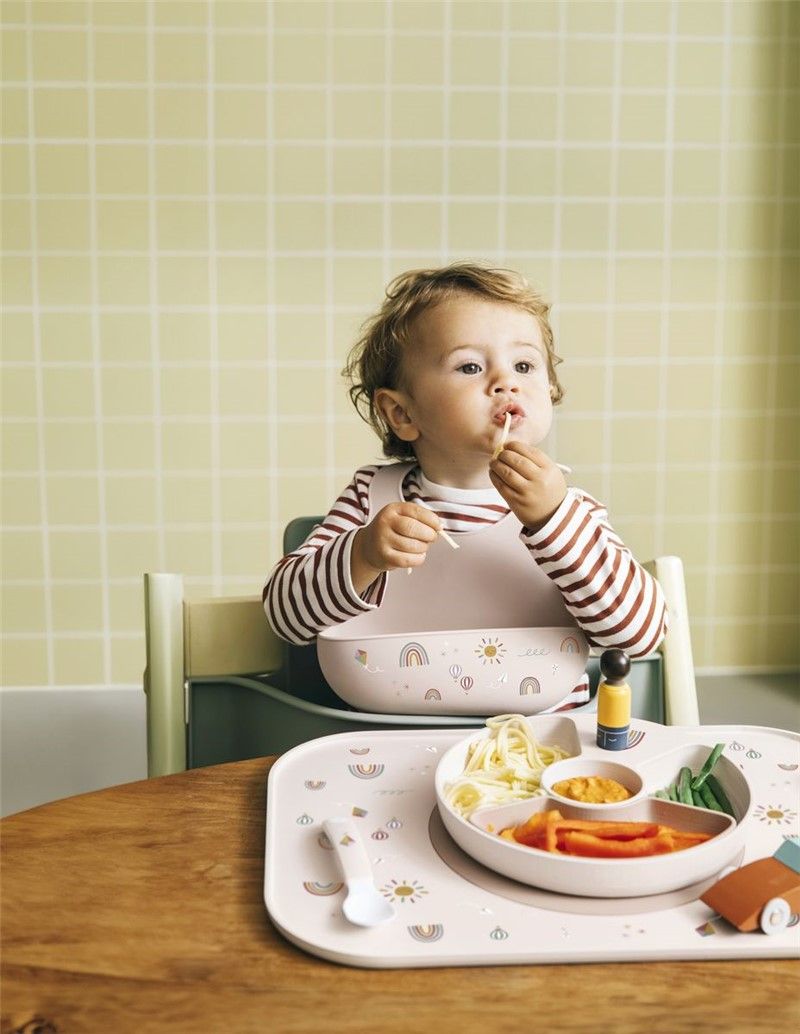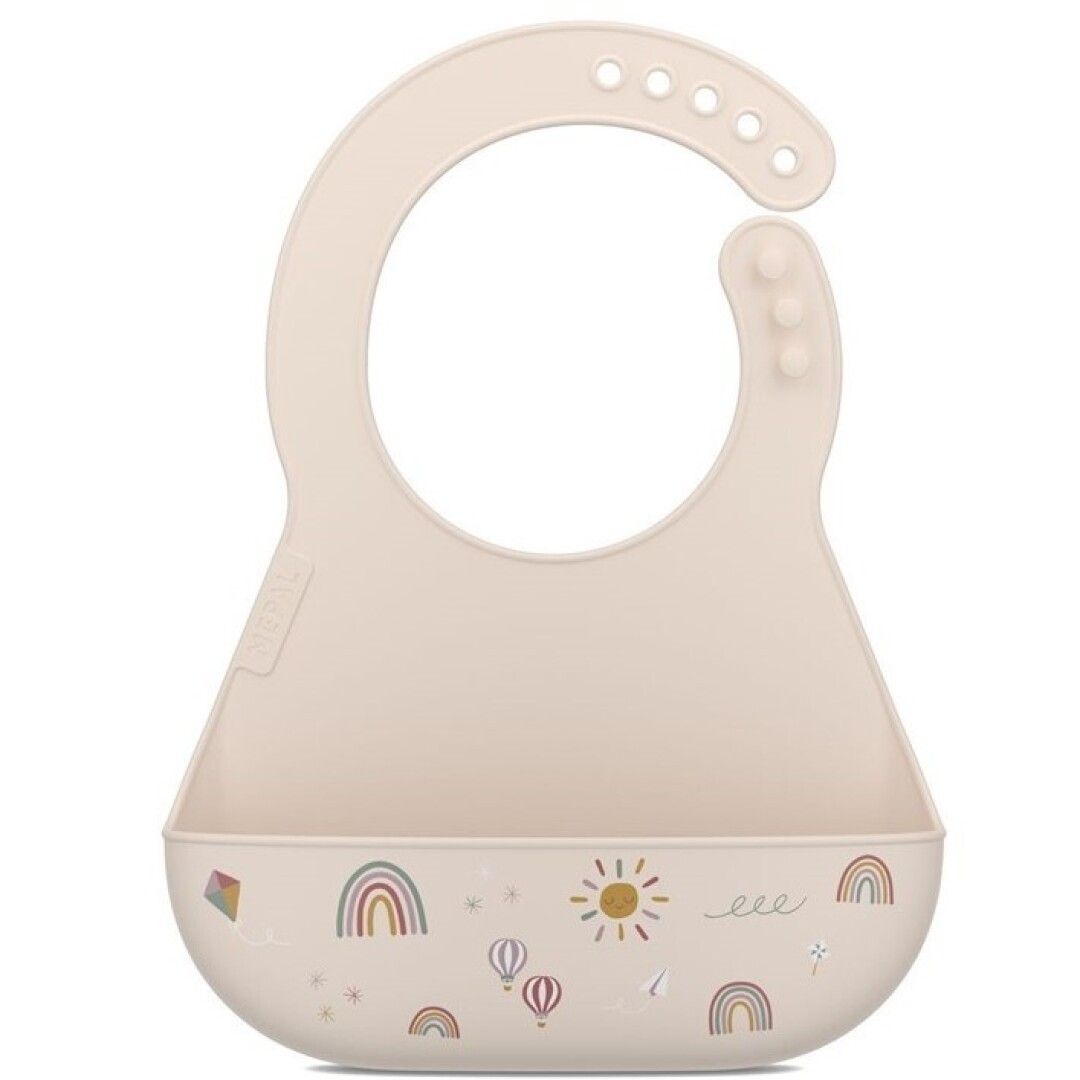 Babero de silicona de la colección MIO con cierre ajustable en el cuello y bolsillo profundo para atrapar la comida. Fácil de limpiar y transportar.