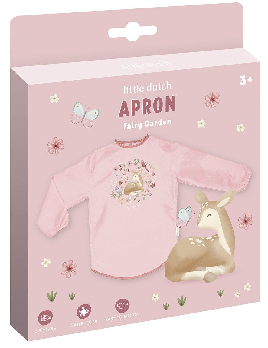 Bata de arte rosa de la colección Fairy Garden de Little Dutch. Se cierra con un velcro en la parte trasera y tiene goma elástica en las empuñaduras. + 3 años
