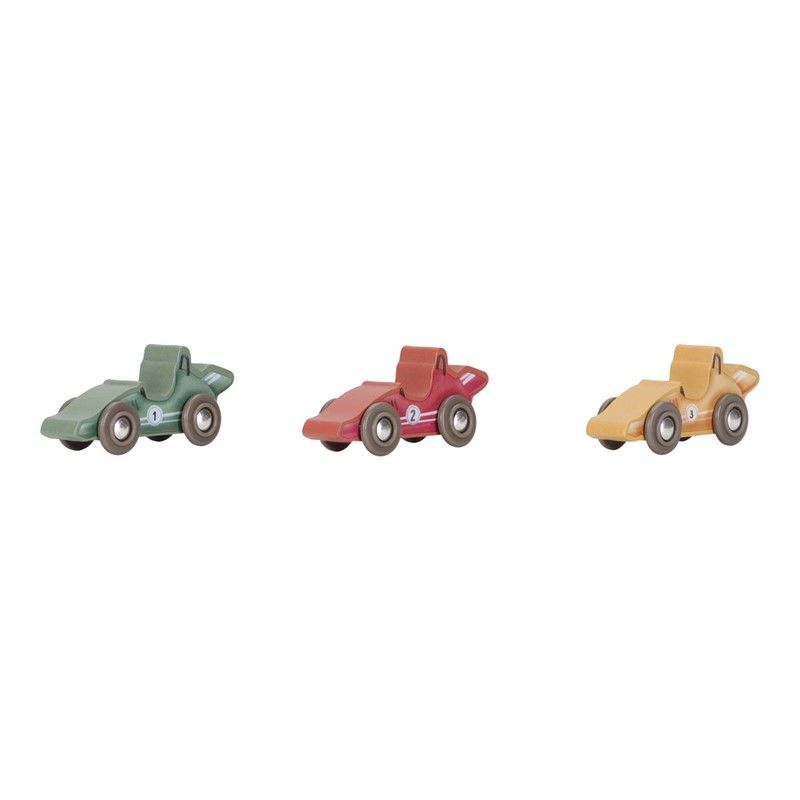 ¡Arranquen motores! Este estuche de cartón se transforma en una pista de carreras completa. El set incluye todo lo necesario para una carrera emocionante: coches de carreras, pilotos, una línea de meta, señales de tráfico, un trofeo y un podio de ganadores. +18 meses