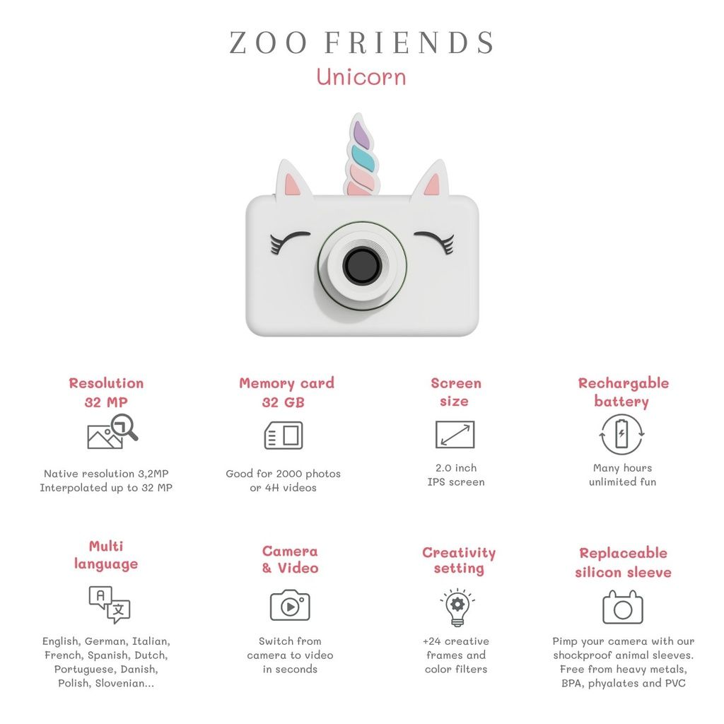 Incluye la cámara , tarjeta MicroSD de 32GB, cable USB, correa para la cámara, pegatinas, protector de pantalla y manual de instrucciones.