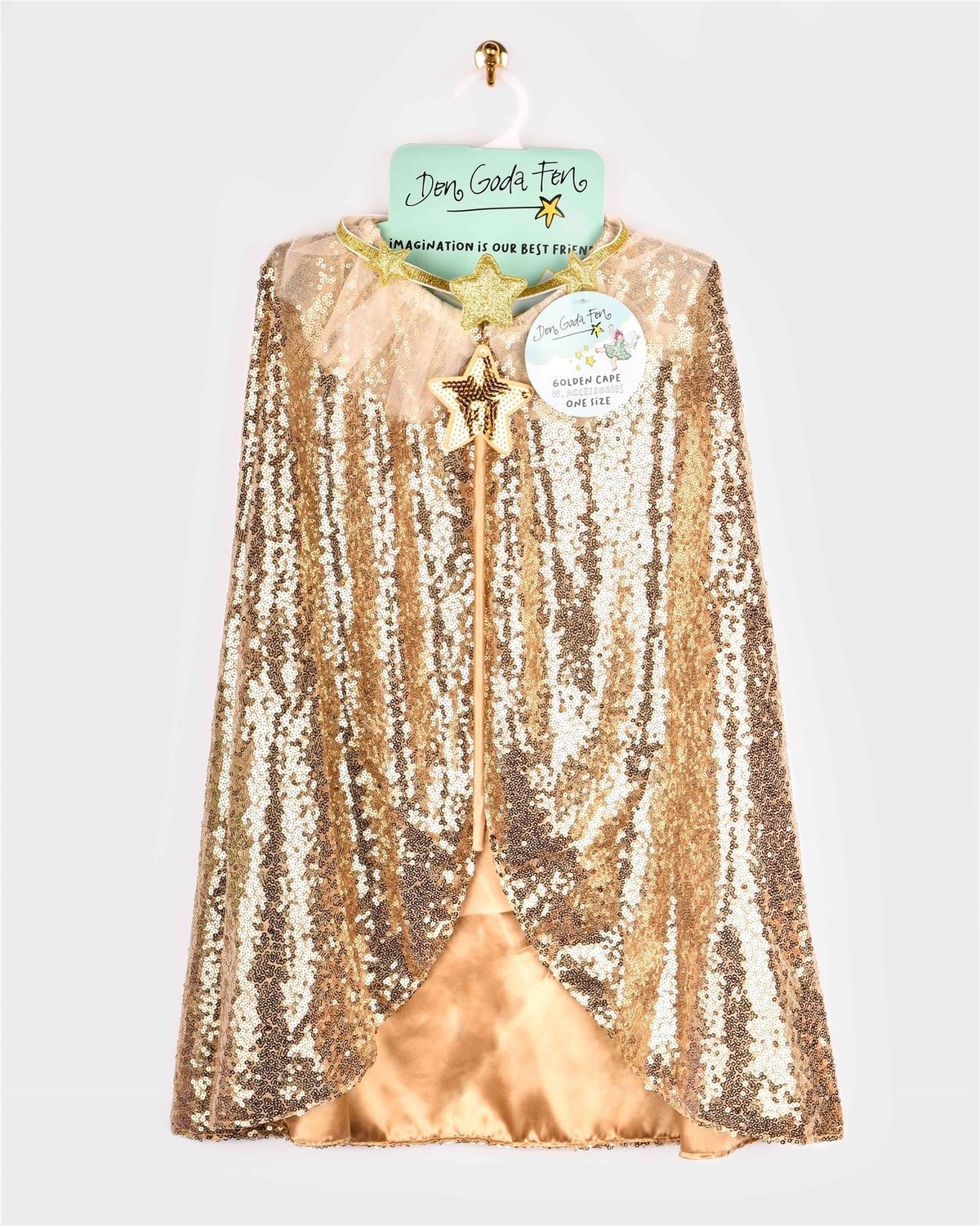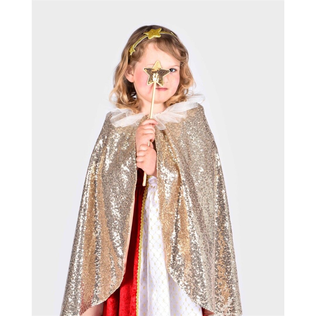 Capa dorada con lentejuelas y cuello de gasa. El interior de la capa está forrado con raso en color dorado. Incluye una diadema con adornos de estrellas y una varita recubierta de satén con una estrella de lentejuelas doradas.