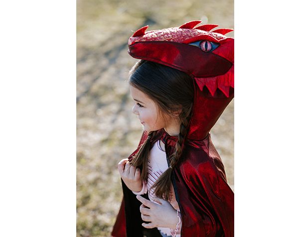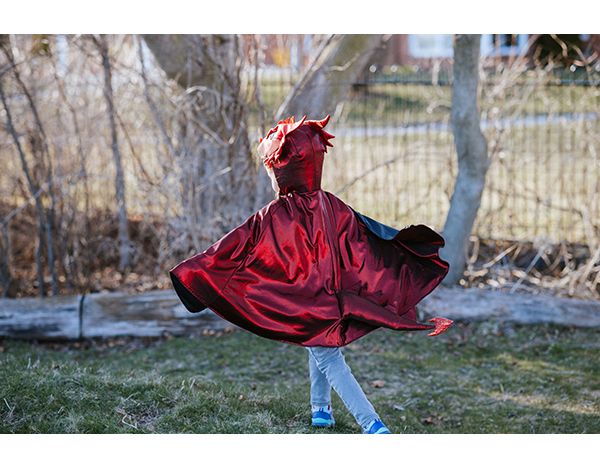 Capa de dragón metálico color rubí que brilla con intensidad, diseñada para inspirar imaginación y diversión. Ideal para niños que disfrutan de un toque mágico en sus atuendos.