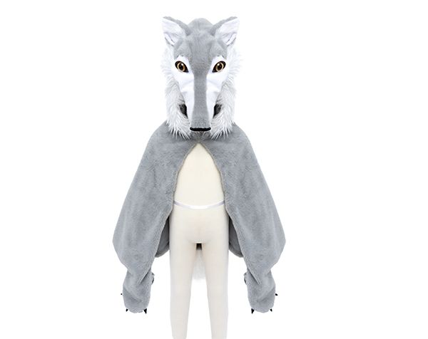 Capa de lobo con capucha realista, orejas y cola, diseñada para juegos de fantasía y disfraces temáticos. Ideal para pequeños aventureros que aman los animales del bosque.