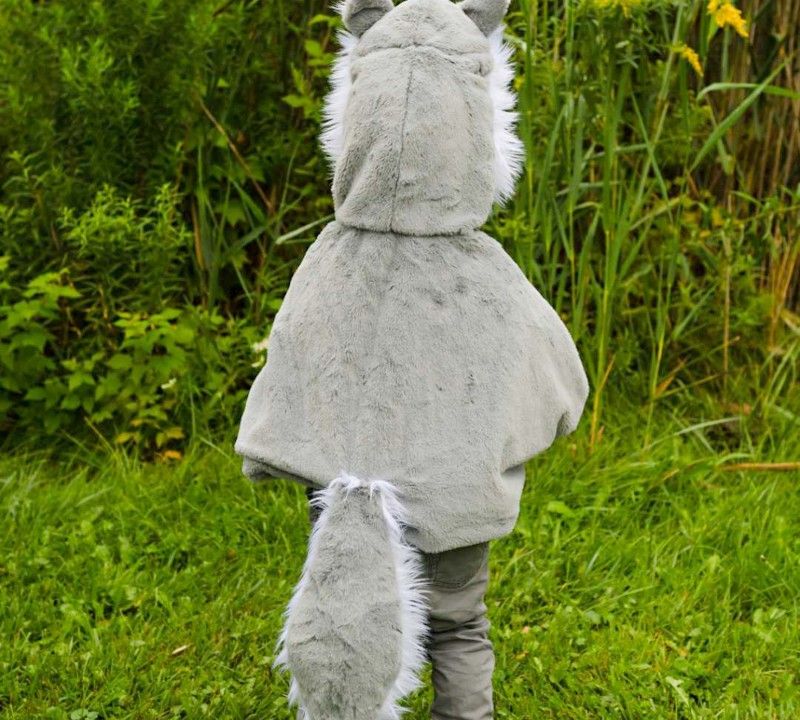Capa de lobo con capucha realista, orejas y cola, diseñada para juegos de fantasía y disfraces temáticos. Ideal para pequeños aventureros que aman los animales del bosque. +12 meses