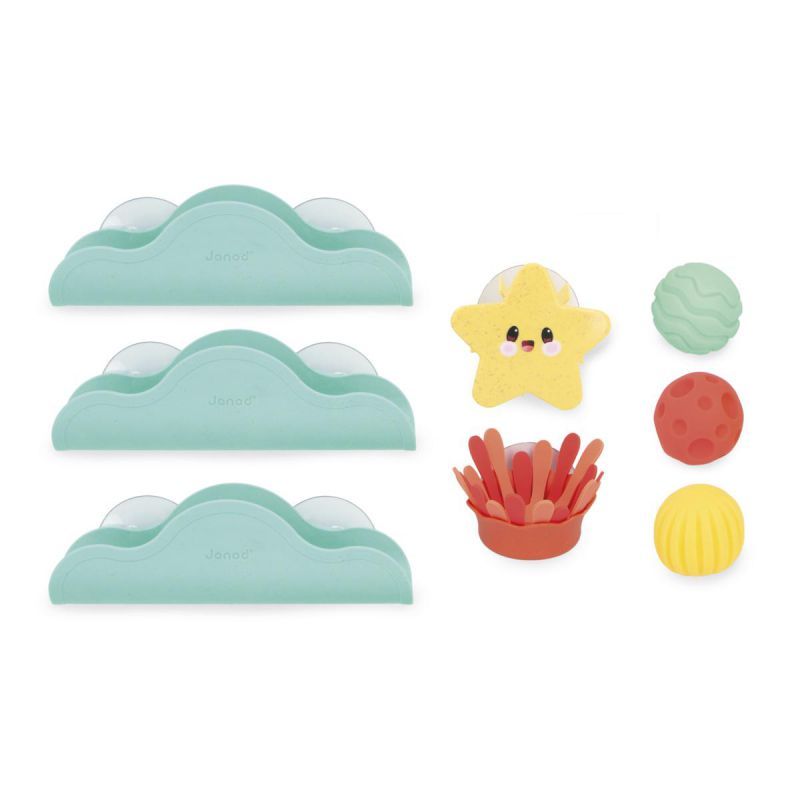 ¡Todo listo para la hora del baño! Descubre nuestro bonito circuito de baño marino compuesto por 3 toboganes, 3 bolas sensoriales, 1 estrella giratoria y una pequeña anémona que recoge la bola a su llegada. Para despertar la curiosidad y estimular el tacto, las 3 bolas tienen una función sensorial. Los accesorios están fabricados con paja de trigo. Ideal para desarrollar la motricidad fina. Juguete para el baño para niños a partir de 12 meses.