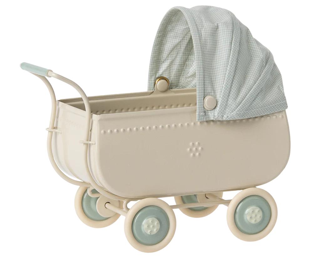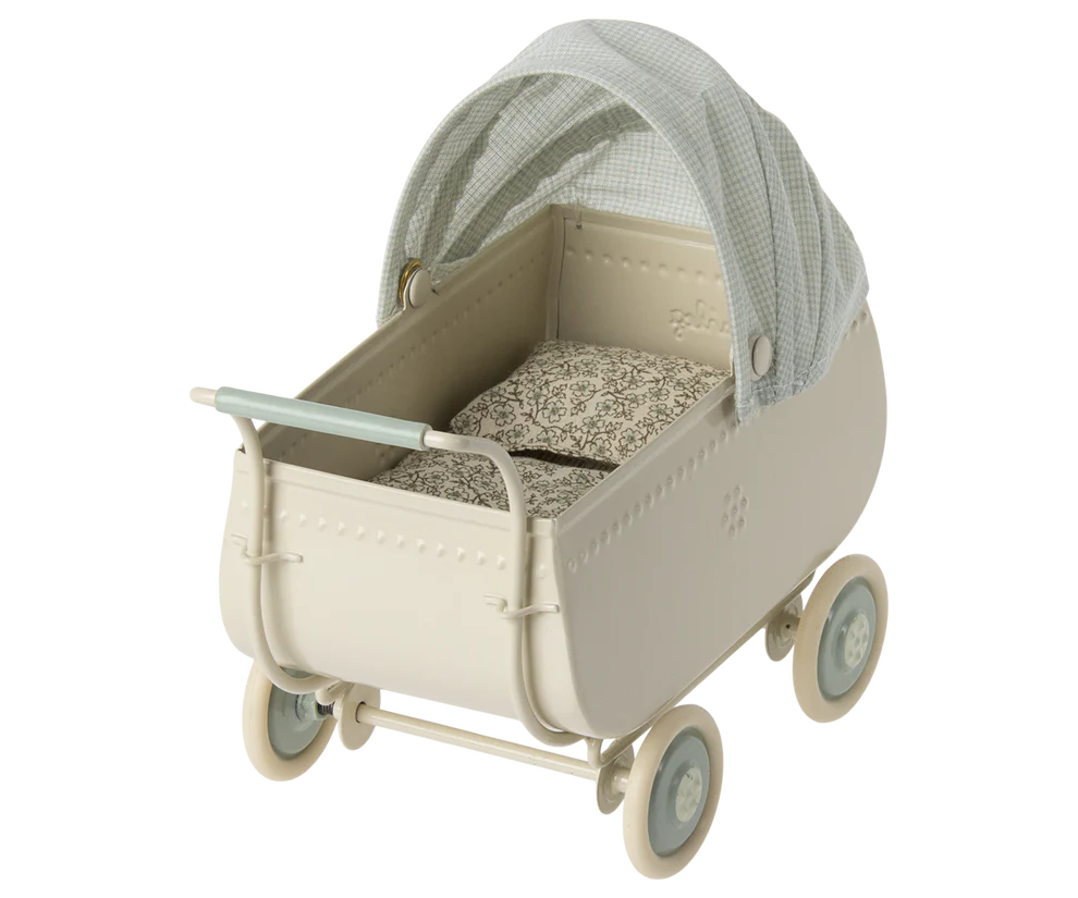 Un precioso cochecito con un exclusivo aspecto vintage. La parte metálica tiene detalles en relieve en los costados que se completa con una capota de tela. Este producto único está parcialmente hecho a mano, por lo que pueden haber variaciones.