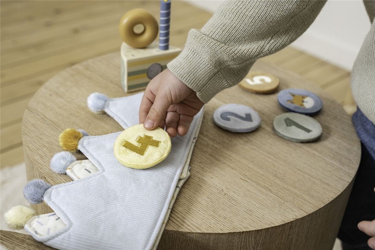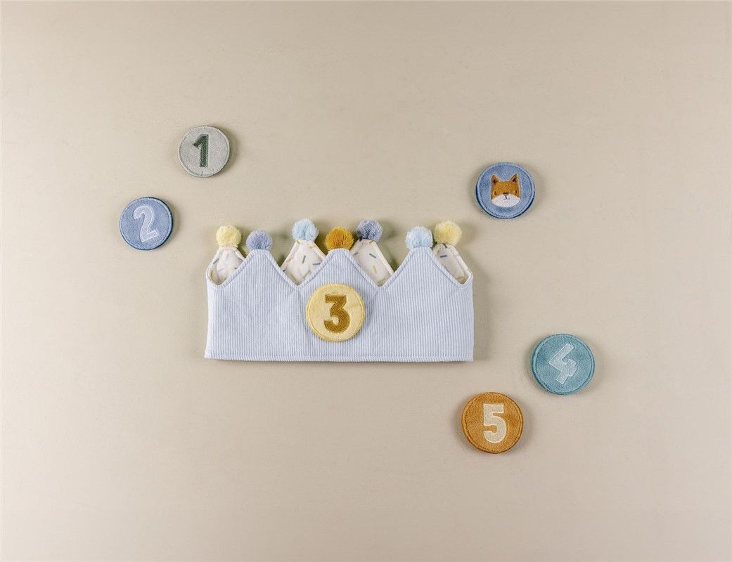 ¡Feliz cumpleaños! Celebra con estilo con esta adorable corona de cumpleaños y espolvoree un poco de magia de cuento de hadas en su día especial. Viene con números intercambiables del 1 al 5, lo que lo hace perfecto para los hitos de crecimiento de su pequeño. ¡Adjunta el número de cumpleaños a la corona y captura esos preciosos momentos! U opta por el parche de un animal cuando tu pequeño quiera ser el rey o la reina del país de las maravillas. La corona está confeccionada en suave tejido acolchado y acanalado en color azul claro rematada con pompones de colores. El cierre de velcro permite que la corona se adapte y crezca con su hijo. Observe a su pequeño usar la corona con orgullo, mostrando su edad con cada sonrisa y risita. ¡Feliz celebración!
