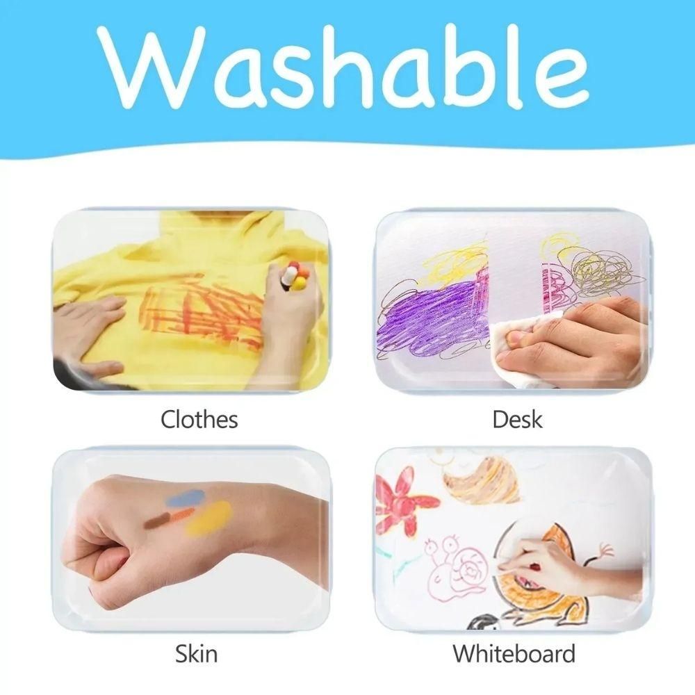 Con materiales no tóxicos y certificaciones ASTM y CPC, ofrecen tranquilidad a quien cuida. Si algo se mancha, se limpia fácil: un poco de agua (y jabón suave si hace falta) y el color desaparece de piel, ropa o superficies.