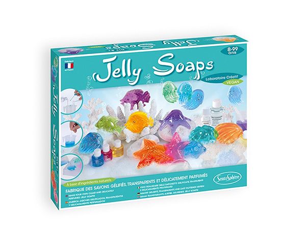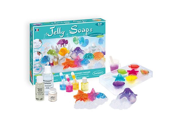 Mezcla un polvo gelificante 100% natural con glicerina, base espumosa, perfume y colorantes, luego agrega agua caliente y revuelve por unos segundos. Vierte la mezcla en un molde y espera 30 minutos a que se enfríe antes de desmoldar tu jabón. Te encantará lavarte las manos con su divertida textura.