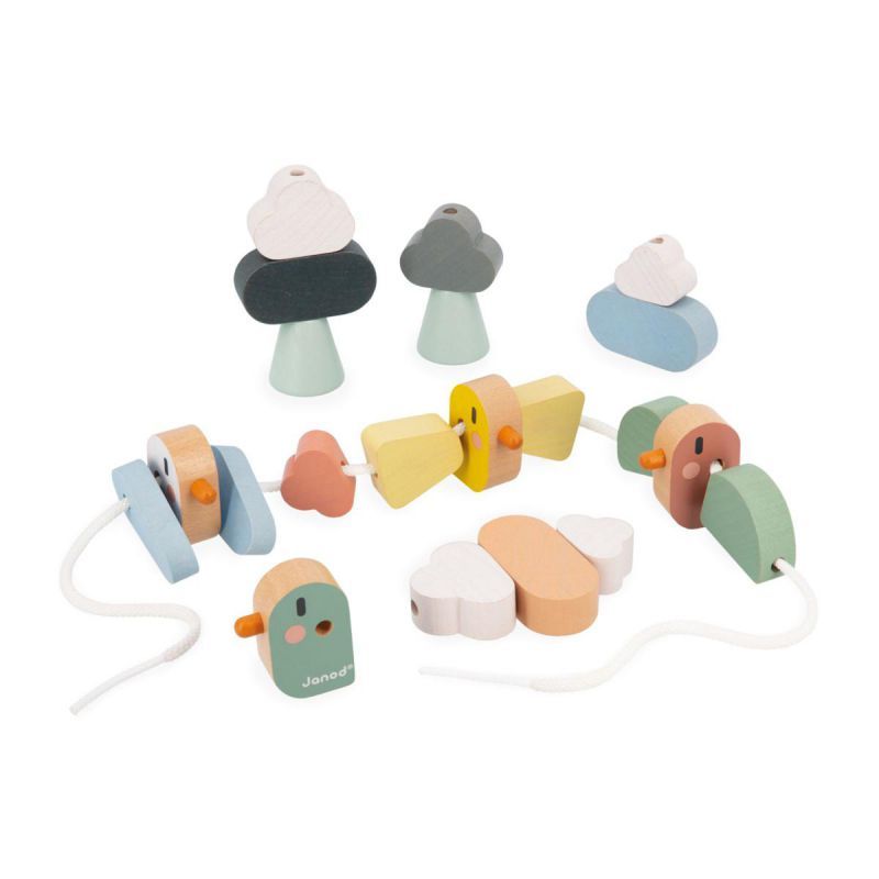¡PÍO, PÍO! ¡Mira los pájaros posados en lo alto entre las nubes! Acompañe a su hijo en el desarrollo de su motricidad enhebrando las diferentes cuentas en el cordón. En este juguete encontrará 4 cuentas de pájaros, 8 cuentas para las alas, 9 cuentas para formar las nubes y un cordón grande con puntas rígidas para que las cuentas sean más fáciles de enhebrar. Este juguete es perfecto para acompañar a su hijo en el desarrollo de su imaginación y su motricidad. Juguete de estimulación de madera FSC para niños a partir de 2 años.