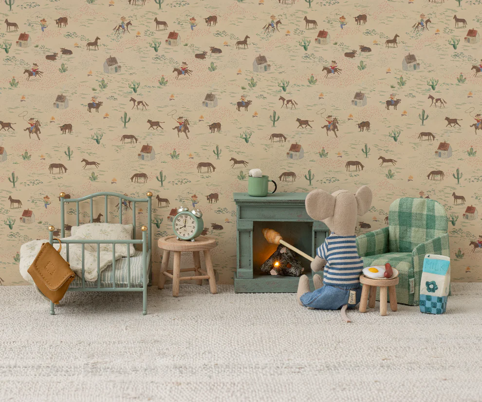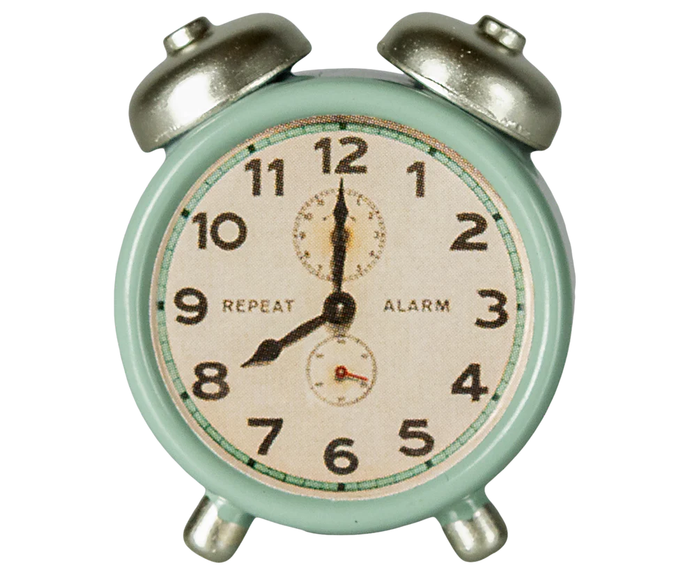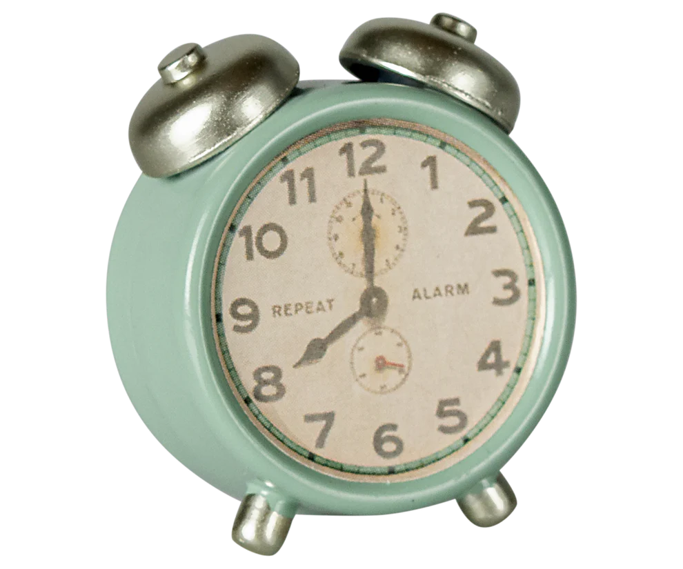 Suena la alarma y un nuevo día lleno de aventuras comienza. El despertador es de metal y con muchos pequeños detalles.
