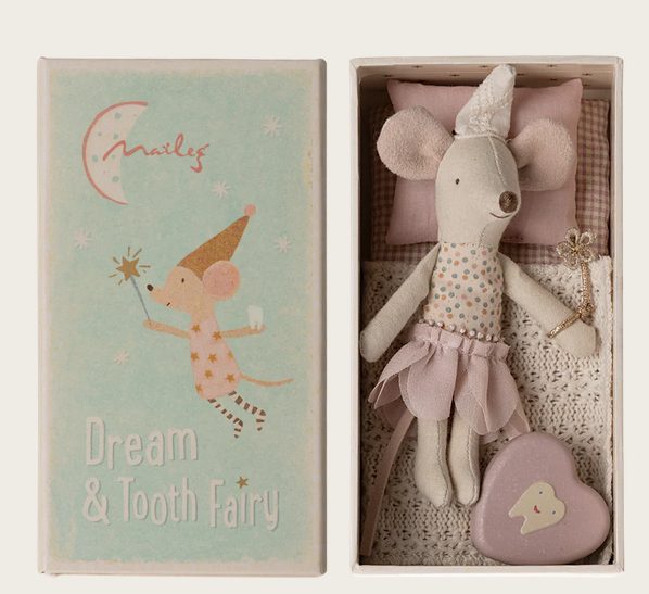 Por la noche, el Hada ratoncito Pérez esparce polvo mágico, recoge los dientes y trae golosinas para que tengas dulces sueños. Con su vestido mágico duerme plácidamente entre suaves sábanas. Incluye caja para guardar los dientes y caja de cerillas.