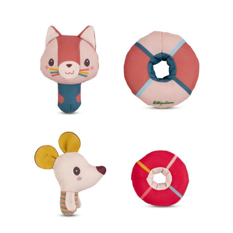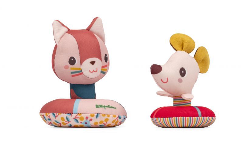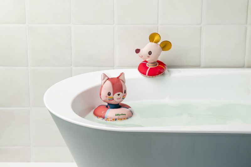 ¡A Jeanne la gata y a Nina la ratoncita les encanta nadar! Cómodamente instaladas en sus flotadores, flotan alegremente sobre el agua y acompañan al niño en todas sus aventuras acuáticas.