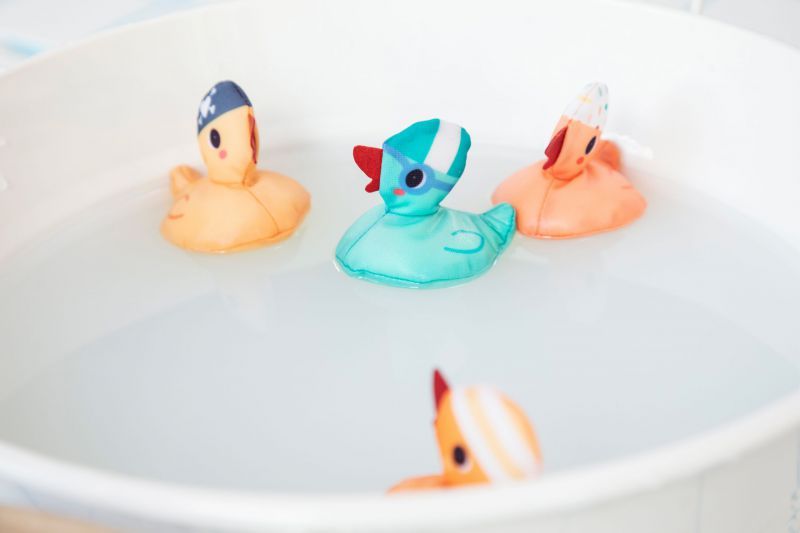 ¡Plis, plas 4 patitos chapotean felices en el agua! Pero cuidado un cangrejo travieso cuelga de la caña y viene a hacerles cosquillas para atraparlos. Cada patito esconde un número en su barriguita: ¡el niño debe pescar, contar e inventar mil historias divertidas! +12