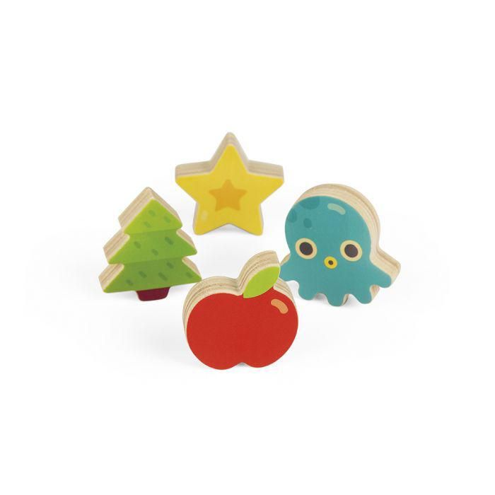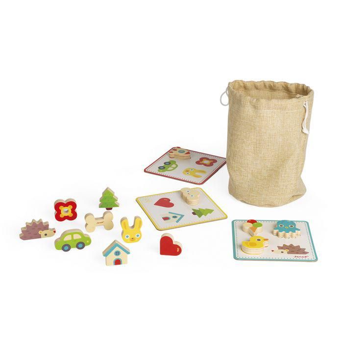 De 2 a 5 jugadores. 21 piezas de madera, una bolsa de algodón y 5 cartones de juego. Mete la mano en la bolsa para ser el primero en encontrar las 4 piezas que aparecen en el cartón de juego, ¡solo vale tocar! ¡Pero cuidado con la pieza «trampa»! El que saque el hueso deberá volver a meter en la bolsa todas las piezas que ya haya ganado. Variante para los más pequeños: cada jugador también puede sacar, por turnos, una pieza de la bolsa. Si dicha pieza aparece en su cartón de juego, la coloca encima; si no, la vuelve a meter en la bolsa. Un juego ideal para desarrollar el sentido del tacto y la motricidad fina de su hijo.