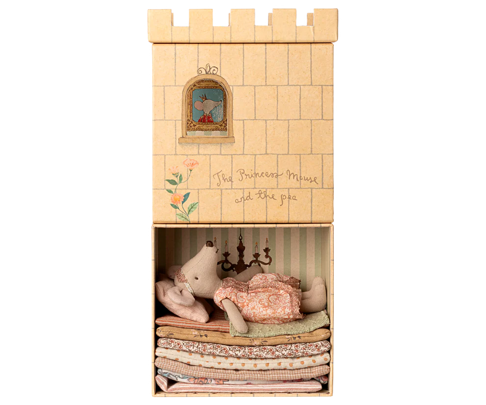 Un artículo clásico de Maileg. El famoso cuento de hadas «La princesa y el guisante» es su inspiración. El conjunto incluye un castillo con colchones, un guisante y un ratón princesa. Combínalo con otros ratones y accesorios para jugar aún más.