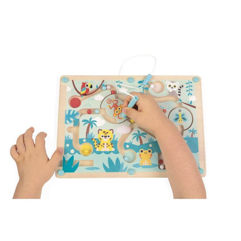 ¡Bienvenidos a la selva! Un lugar lleno de animales exóticos. Su hijo tendrá que atravesar el laberinto para repartir las 12 bolitas de colores a los animales correctos, usando el lápiz magnético. + 2 años