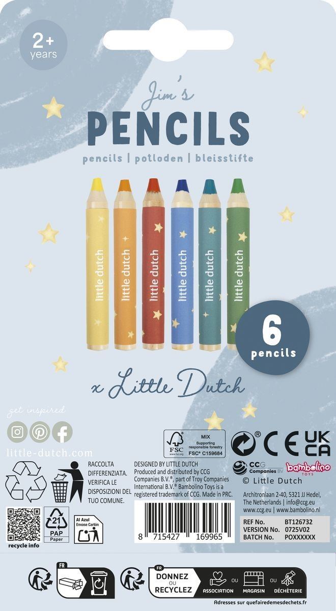 Lápices de colores de madera de la colección del muñeco Jim de Little Dutch, pack de 6 lápices. + 3 años