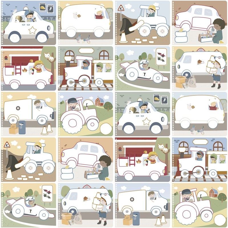 Libro mágico inspirado en el mundo de los coches del muñeco Jim, incluye lápices de colores de madera, 20 páginas impresas y 10 páginas en blanco.