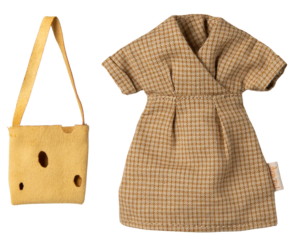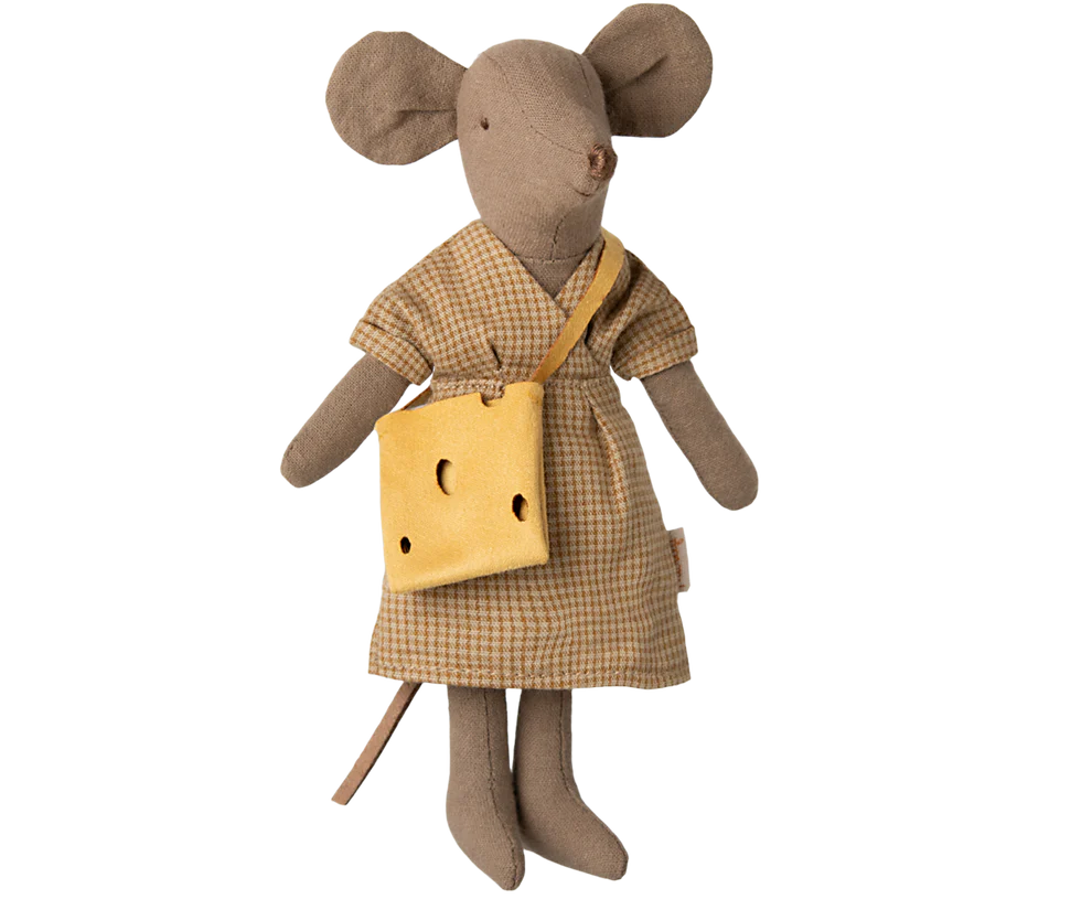 Mamá ratón con cuerpo de tela marrón claro. Lleva un vestido y un bolso con agujeros tipo queso. Este ratón se adapta a los muebles y accesorios de tamaño ratón. Al comprar más ropa por separado, ropa en tamaño mamá / papá se ajusta a este ratón.