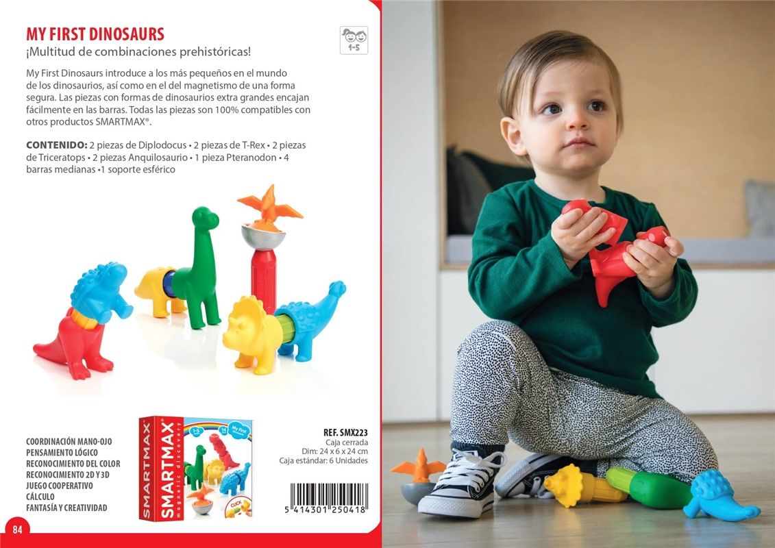 ¡Multitud de combinaciones prehistóricas! My First Dinosaurs introduce a los más pequeños en el mundo de los dinosaurios, así como en el del magnetismo de una forma segura. Las piezas con fromas de dinosaurios extra grandes encajan fácilmente en las barras. Todas las piezas son 100% compatibles con otros productos SMARTMAX. +12 meses