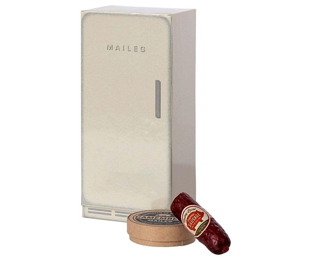 El lugar perfecto para almacenar sus alimentos para que se mantengan frescos y fríos. Dentro de la nevera encuentras una pequeña salchicha y queso.