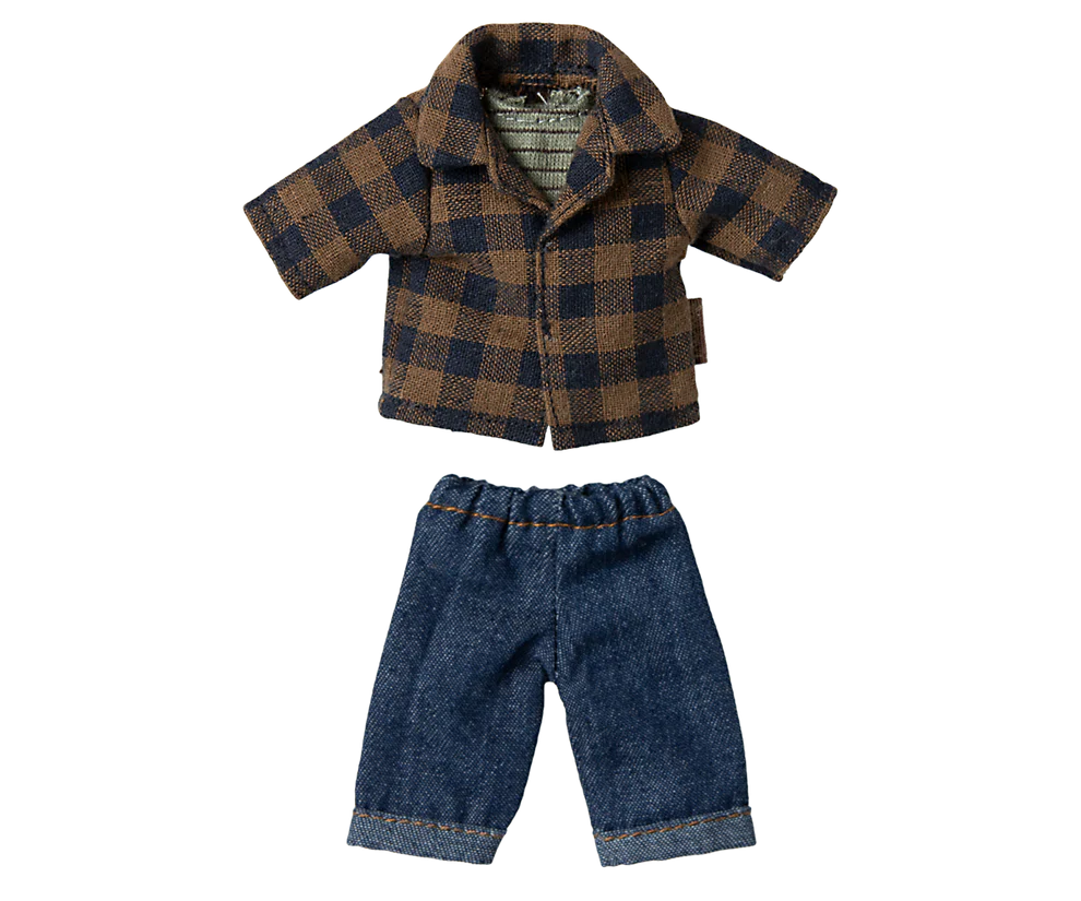 Papá ratón con cuerpo de tela marrón claro. Lleva camisa a cuadros, camiseta de tirantes y pantalones vaqueros. A este ratón le quedan bien los muebles y accesorios de la talla ratón. Al comprar más ropa, la talla mamá/papá le sirve a este ratón.