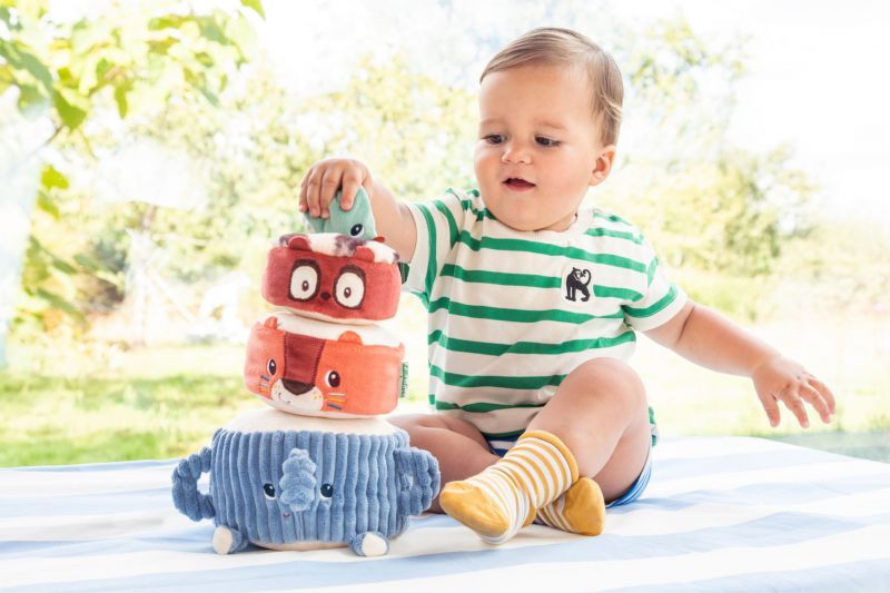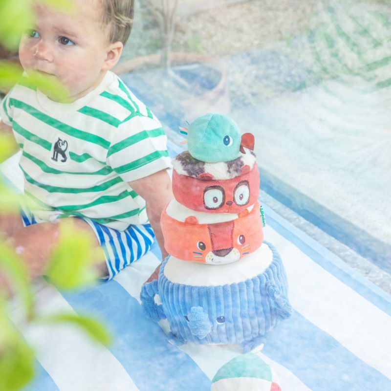 ¡Albert el elefante lleva orgulloso a sus amigos de la selva: Jack el león, Elvis el lémur y un periquito en la cima! El bebé los apila uno a uno para construir una divertida pirámide de tela, descubriendo en cada paso un sonido diferente. Y cuando la pirámide está completa, llega el reto más divertido: ¡lanzar la pelota de tela para hacerla tambalear y caer entre risas!