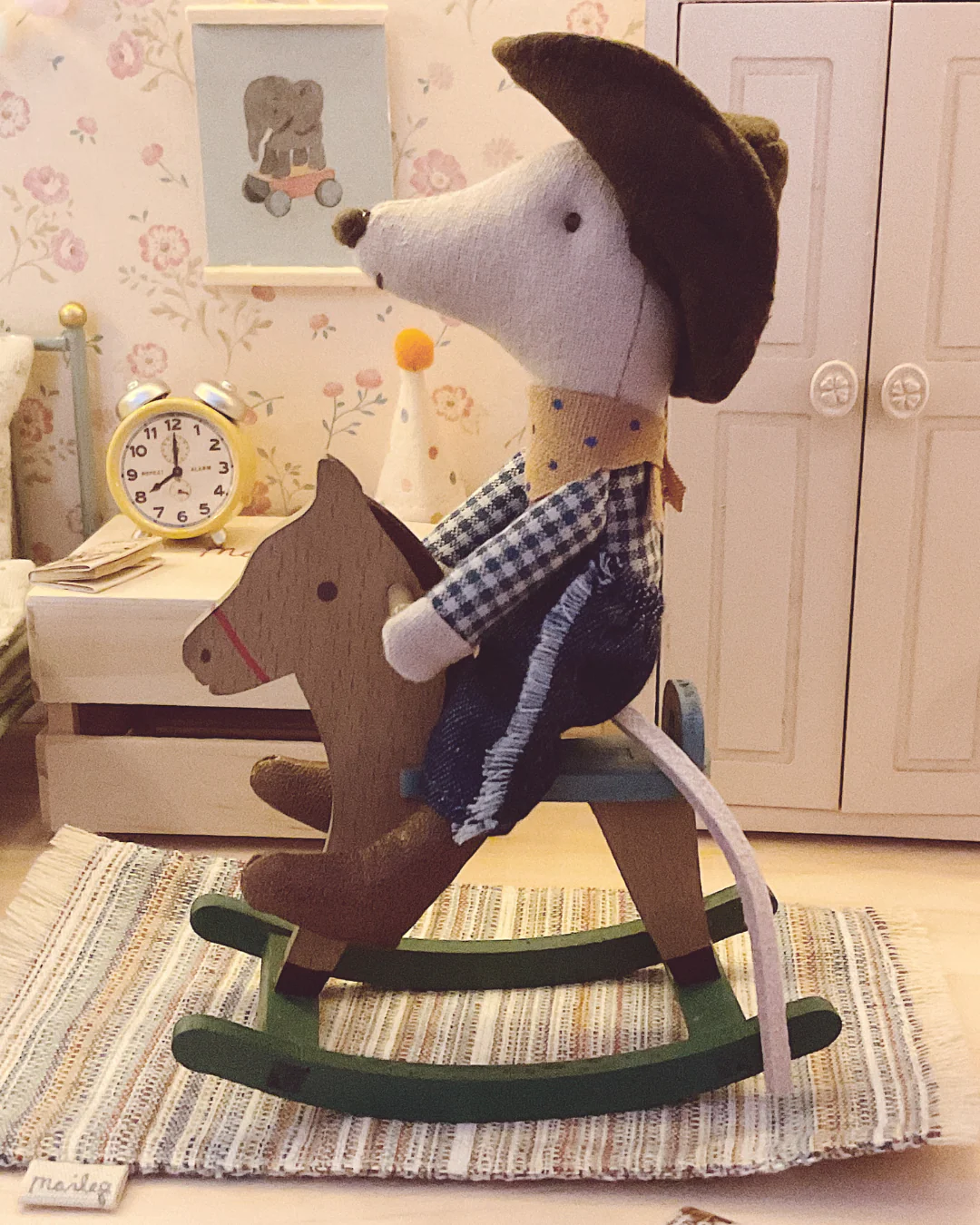 Un ratón vaquero con imanes en las manos, vestido con jeans, bufanda y sombrero, monta su caballo balancín.