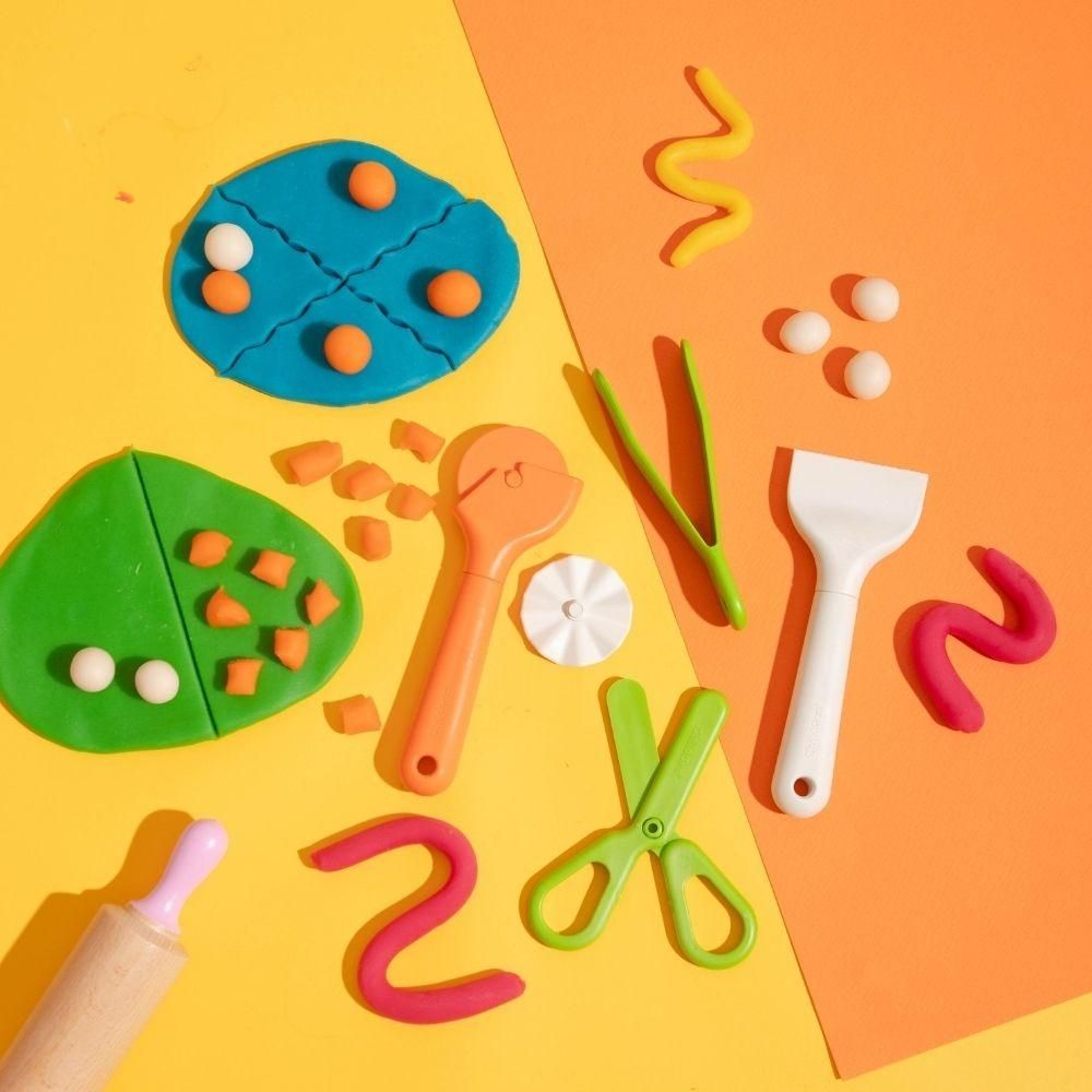 Set de 5 herramientas con diseño ergonómico, ideal para modelar plastilina de forma cómoda y segura desde los primeros años. Incluye 2 rodillos, unas tijeras, una espátula y unas pinzas especialmente diseñadas para manos pequeñas. Un conjunto versátil que estimula la creatividad y potencia la motricidad fina a través del juego sensorial y libre.