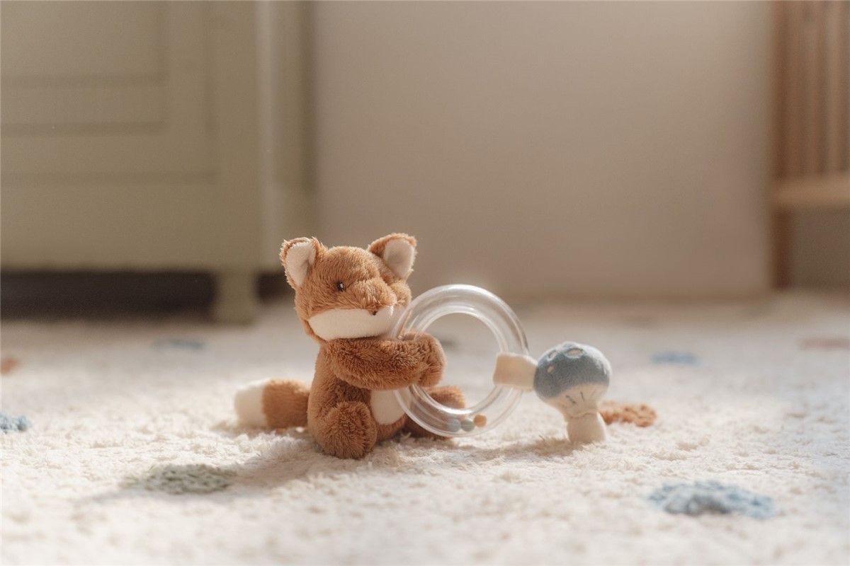 ¡Agarra, gira y sacude! El adorable zorro con su suave pelaje y su pequeña cola te invita a jugar y a poner en movimiento este sonajero. También ha elegido un pequeño hongo para que lo acaricies. El anillo transparente contiene 3 pequeñas cuentas de colores que empiezan a sonar cuando tu bebé juega con este divertido juguete. El sonajero no solo despierta la curiosidad y los sentidos de tu bebé, sino que también mejora la coordinación mano-ojo.