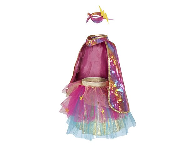 Tutú rosa y dorado con capa y máscara, ideal para superhéroes pequeños con estilo. Materiales suaves que garantizan comodidad. +4 años
