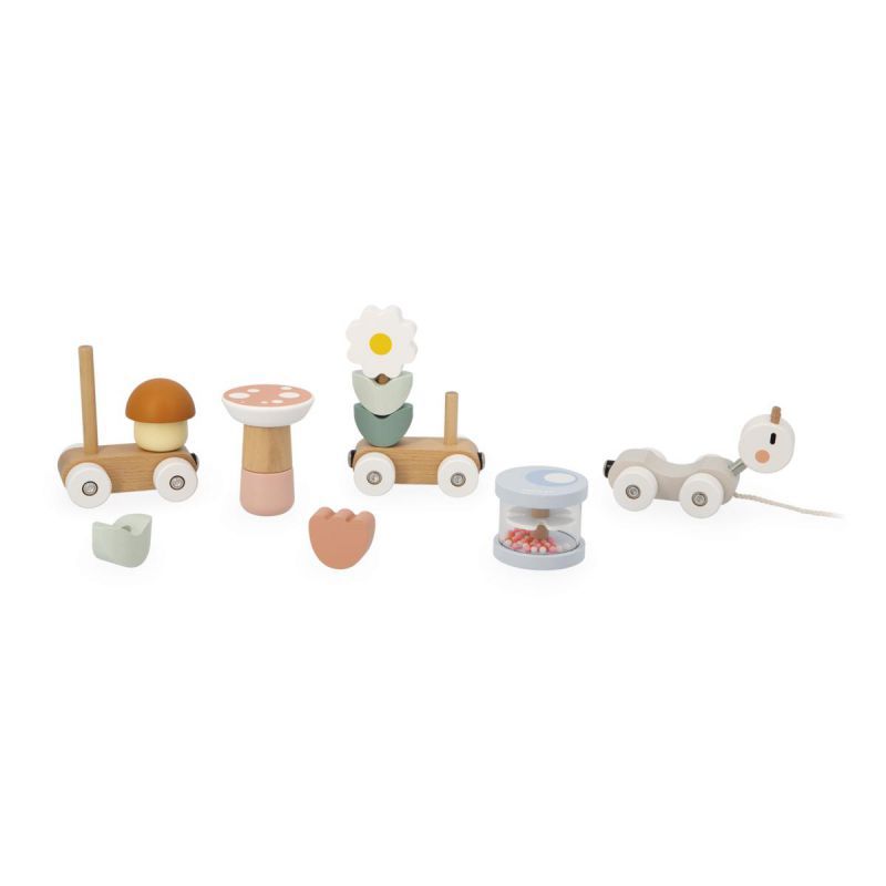 Vámonos a dar un paseo bucólico, descubriendo flores y setas. Este bonito tren de caracol está compuesto por 3 vagones con 2 flores y 2 setas para reconstruir (10 piezas). El caparazón del caracol es desmontable: rueda sobre sí mismo cuando el tren avanza y se transforma en un sonajero de bolitas. Juguete ideal para desarrollar la motricidad fina de los más pequeños y ayudar a los no tan pequeños a aprender a andar, paseando con el tren tirando de su cuerda. Juguete de estimulación de madera FSCTM. Juguete de arrastre para niños a partir de 12 meses.