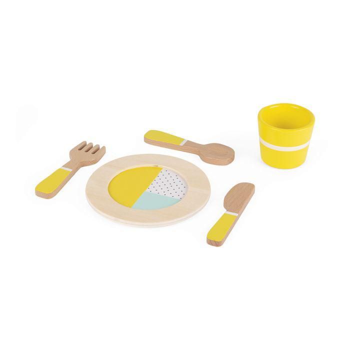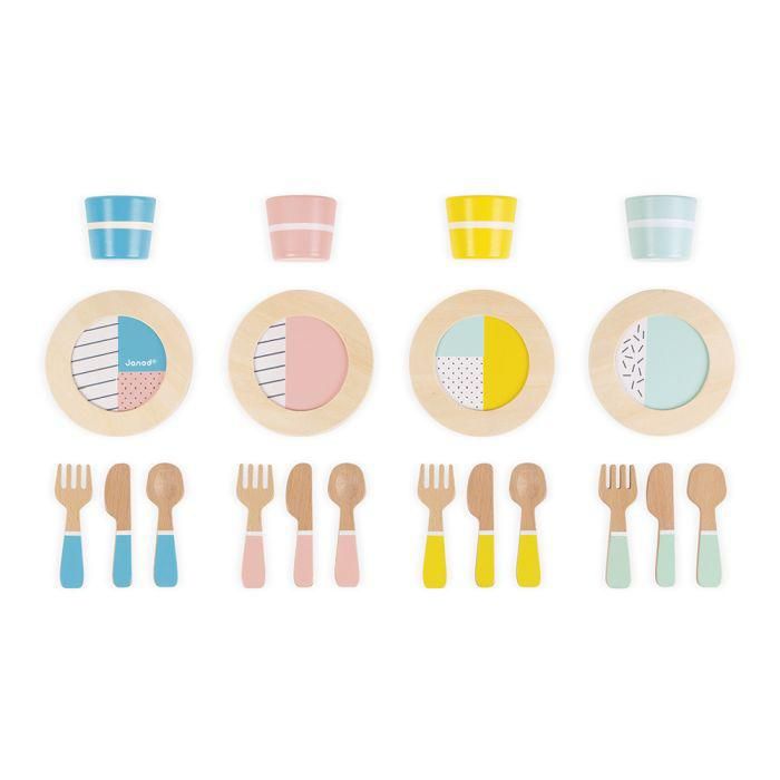 Para niños de 3 a 8 años. Juguete de madera. ¡Bonita vajilla de juguete de madera, con colores mixtos, ideal para los pícnics en familia! Set de vajilla de juguete completa para 4 personas, compuesta por 20 piezas: 4 platos, 4 vasos, 4 juegos de cubiertos (cuchillo, tenedor y cuchara).