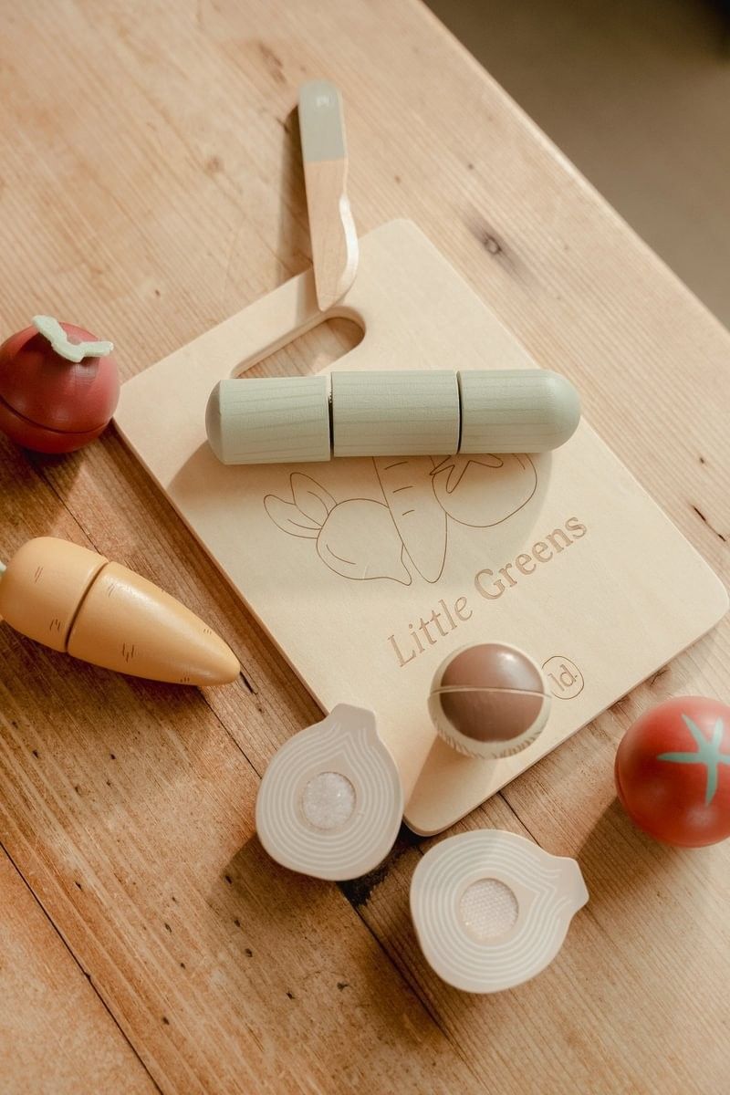 ¡Es hora de preparar platos saludables de verduras! Este juego de madera para cortar verduras incluye seis tipos diferentes: zanahoria, pepino, tomate, cebolla, remolacha y champiñón. + 2 años
